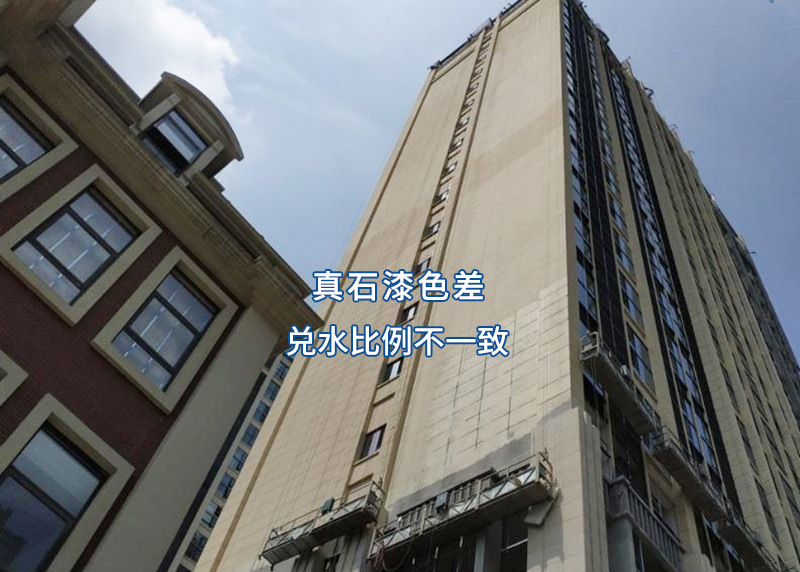 大家都知道,不同溫度下施工,真石漆成膜快慢不一樣,容易引起墻體顏色差異。其中原因有一點(diǎn)可能會(huì)被忽略,就是采用鋼管架施工?,F(xiàn)在氣溫逐漸升高,陽光天氣增多,采用鋼管架施工,遮擋部分會(huì)造成真石漆干燥過慢,墻面形成明顯對(duì)比。建議采用吊籃從上往下施工,同一面墻盡量保持同一時(shí)段施工,避免發(fā)生色差。