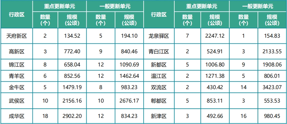 成都各行政區(qū)總共計(jì)劃有78個(gè)重點(diǎn)更新單元,規(guī)模15781.47公頃;一般更新單元119個(gè),規(guī)模18041.02公頃。各行政區(qū)更新單元數(shù)量及規(guī)模如下: