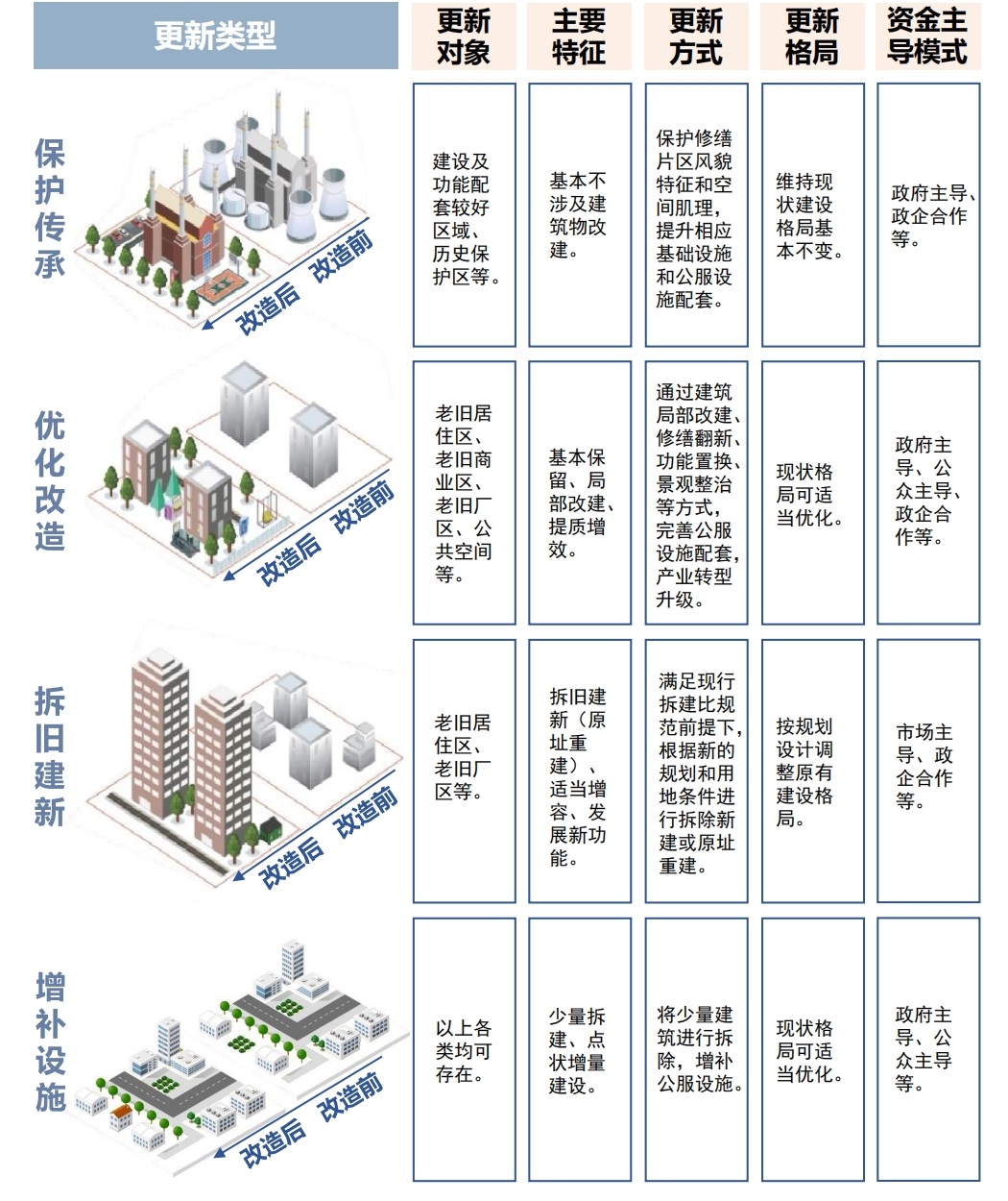 根據(jù)《四川省城市更新工作指引》,城市更新具體分為了保護(hù)傳承、優(yōu)化改造、拆舊建新和增補(bǔ)設(shè)施四種方式。