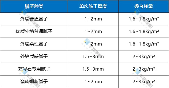 不同的膩子,施工厚度和耗量也有所不同。以下施工厚度和理論耗量可供參考: